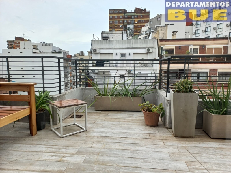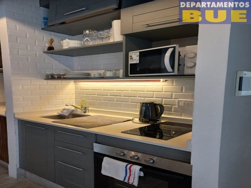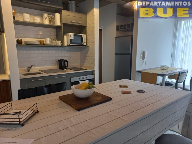 La cocina integrada equipada con heladera con freezer, microondas, horno y anafes eléctricos, con salida al gran balcon aterrazado de vista al frente.